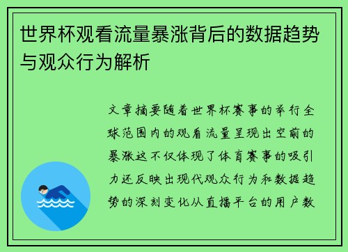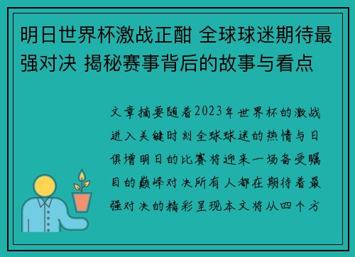 2014年巴西世界杯,作为世界足球的盛宴,给球迷们带来了无数的经典瞬间和激情场面。比赛过程中,不仅有强队之间的巅峰对决,也有许多令人热血沸腾的比分回顾和赛场上令人难以忘怀的精彩时刻。本篇文章将从四个方...